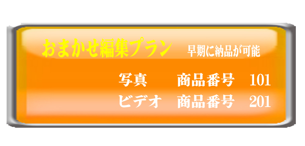 | 6)ビデオ編集作業の確認 | ビデオ編集には、『おまかせ編集プラン』と『こだわり編集プラン』があります。 おまかせ編集プランは、素材の編集を編集者の判断に任せて、素材ごとに編集作業を行います。再編集は出来ません。 こだわり編集プランは、素材ごとにタイトルを挿入し、ご要望がありましたら、お客様所有のオリジナル音源を挿入することが可能で、仮編集後に1回のみ部分修正が可能です。 詳細は、編集プランと、ビデオサンプルでご確認下さい。 |