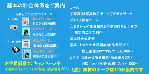 写真は、¥10,000~。ビデオ編は、¥20,000~